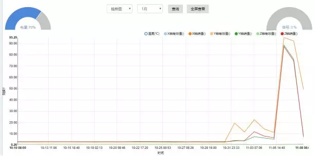 監(jiān)測(cè)前期:在監(jiān)測(cè)的前期,各監(jiān)測(cè)設(shè)備的振動(dòng)及溫度數(shù)據(jù)都在正常的波動(dòng)范圍內(nèi),云端AI系統(tǒng)也在不停地學(xué)習(xí)現(xiàn)場(chǎng)設(shè)備的運(yùn)行狀況,收集與處理數(shù)據(jù)。但是數(shù)據(jù)的異常波動(dòng)悄然來(lái)襲!