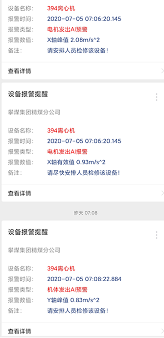 7月5日,安爾法PdM系統(tǒng)監(jiān)測(cè)到了394離心機(jī)的重大異常,并立即向選煤廠相關(guān)負(fù)責(zé)部門推送了2次預(yù)警(1次電機(jī)預(yù)警、1次機(jī)體預(yù)警)和1次電機(jī)報(bào)警信息,選煤廠工作人員收到警報(bào)后,立即到達(dá)了異常設(shè)備現(xiàn)場(chǎng)并與安爾法的專家進(jìn)行溝通,在第一時(shí)間更換了異常設(shè)備394離心機(jī)的相關(guān)零部件。