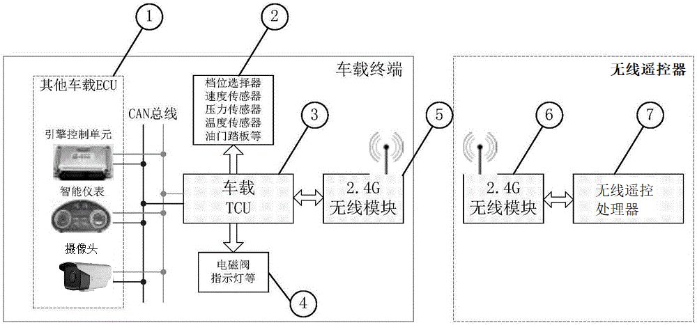 鏟運(yùn)車無線遙控系統(tǒng)分為無線收發(fā)器和遙控器兩部分,通過帶功放的2.4G點(diǎn)對點(diǎn)無線傳輸模塊進(jìn)行遠(yuǎn)程通訊,實(shí)現(xiàn)對鏟運(yùn)車現(xiàn)場數(shù)據(jù)采集及運(yùn)行動(dòng)作控制、遠(yuǎn)程實(shí)時(shí)監(jiān)控、狀態(tài)顯示、參數(shù)設(shè)置、記錄保存以及深層次后端數(shù)據(jù)處理;無線收發(fā)器通過CAN通訊讀取鏟運(yùn)車數(shù)據(jù)包括:監(jiān)測參數(shù)傳感器(2)、車載TCU(3)、功率輸出(4)、2.4G帶功放的點(diǎn)對點(diǎn)傳出模塊(5)以及發(fā)動(dòng)機(jī)ECU(1);遙控器部分包括2.4G無線接入模塊(6)、遙控器處理器(7);安裝在鏟運(yùn)車上的參數(shù)檢測傳感器(2)測取鏟運(yùn)車運(yùn)行狀態(tài)數(shù)據(jù),經(jīng)過信號調(diào)理后送至車載TCU(3),車載TCU(3)根據(jù)速度傳感器、壓力傳感器、檔位選擇器、油門踏板傳感器及發(fā)動(dòng)機(jī)控制單元傳送過來的相關(guān)數(shù)據(jù),調(diào)用相應(yīng)的自動(dòng)換檔策略,驅(qū)動(dòng)相關(guān)的換檔電磁閥及2.4G帶功放的點(diǎn)對點(diǎn)傳出模塊(5);同時(shí),通過無線收發(fā)器帶功放的2.4G點(diǎn)對點(diǎn)傳輸模塊(5)及遙控器的2.4G傳輸模塊(6),實(shí)現(xiàn)車載終端與遙控器的無線通訊。
