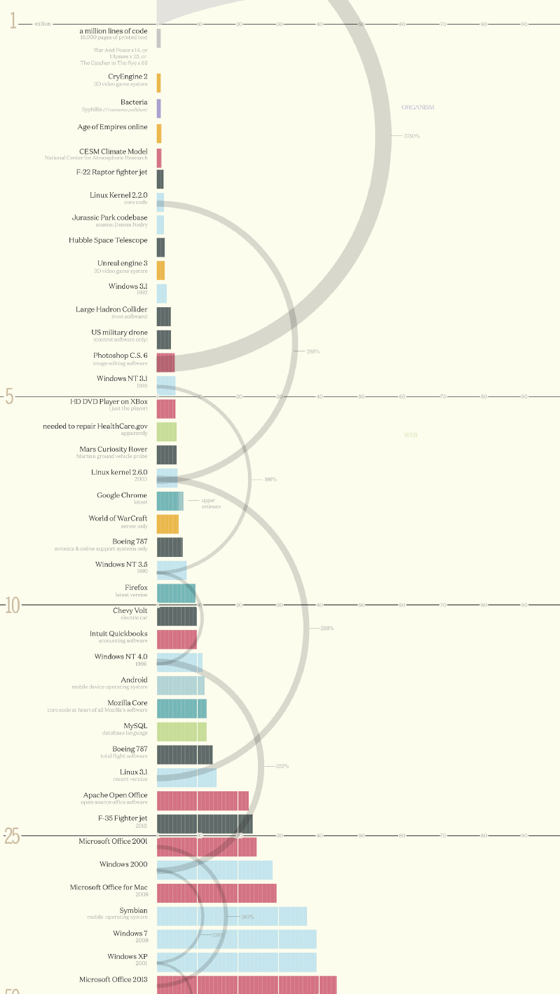 Codebases是一家美國的軟件公司,它統(tǒng)計(jì)過歷史上知名的軟件/系統(tǒng)的代碼量,也就是代碼行數(shù)量,部分?jǐn)?shù)據(jù)如下圖: